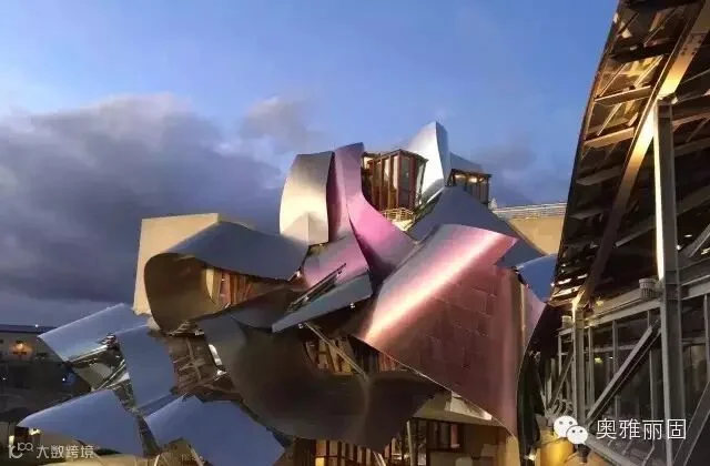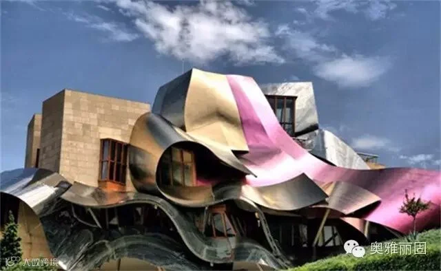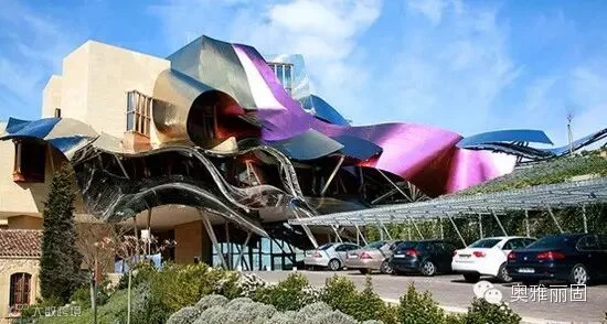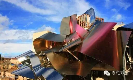 该酒庄以3色(红、银、金)钛板打造出一个波浪翻滚,层叠式不规则的复杂外形,宛如弗拉明戈女郎甩动艳丽的舞裙,在宁静的小镇上跳起热舞来,狂野得也许连西班牙的毕尔巴鄂古根海姆美术馆也望尘莫及。
