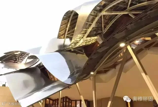 其内外面均镀上金色、银色和玫瑰色的钛,屋顶采用波浪式钛金属材质,成为该酒厂的标志性建筑。