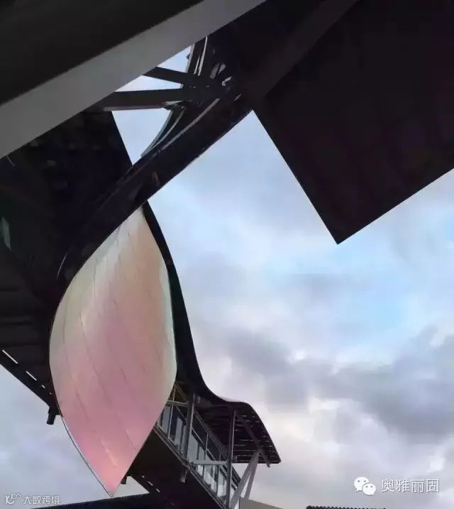 在主体结构之外,出挑超过10米的钛金属及不锈钢板雨棚,这是Gehry的一贯风格。雨庇会跟着时间和天气状况不同反射出迷人的酒红、金色和银色等光亮,加之用自然白色砂岩塑造的建筑顶部,为酒窖增色不少,成为当地的标志性建筑。