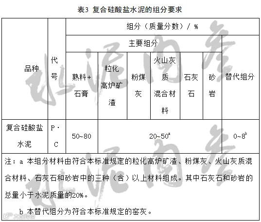 ——将复合硅酸盐水泥中的“本组分材料为由两种(含)以上符合本标准5.2.3的活性混合材料或/和符合本标准5.2.4的非活性混合材料组成。其中允许用不超过水泥质量8%且符合5.2.5的窑灰代替”改为“本组分材料由符合本标准的粒化高炉矿渣、粉煤灰、火山灰质混合材料、石灰石、砂岩中的三种(含)以上材料组成。其中石灰石和砂岩的总量小于水泥质量的20%”以及“08%”的“本替代组分为符合本标准规定的窑灰”(见4.1,2007年版5.1);