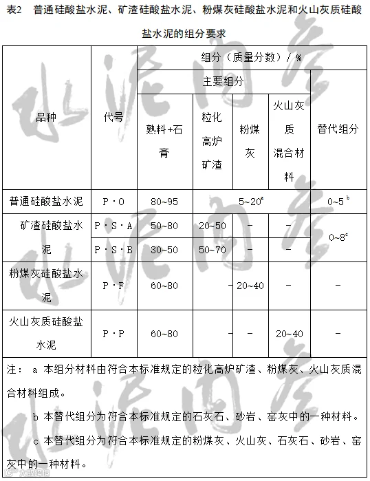 ——将矿渣硅酸盐水泥“其中允许用不超过8%且符合本标准5.2.3的其他活性混合材料或符合本标准5.2.4的非活性混合材料或符合本标准5.2.5的窑灰中的任一种材料代替”改为“08%”的“本替代组分为符合本标准规定的粉煤灰、火山灰、石灰石、砂岩、窑灰中的一种材料”(见4.1,2007年版5.1);