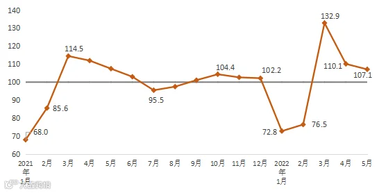 2022年5月份建筑材料工业景气指数为107.1点,比上月下降3.0点,高于临界点,处于景气区间。