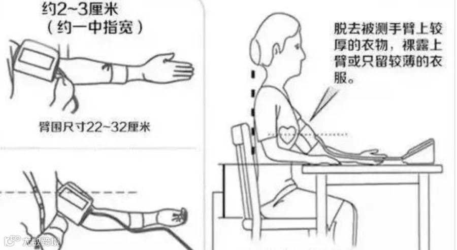 2. 定位置:测量血压时人应取坐位,脱去检测侧手臂上的衣物,将手臂自然伸展平放于与心脏相同高度的桌面。使用左侧上臂或右侧上臂均可,但每次测量时都测同一处,一般习惯使用右手的人建议以右侧上臂血压为观察值。将测量的袖带套入上臂,使得与袖带相连的橡胶管在前臂一侧,袖带大约离肘关节约2-3cm。