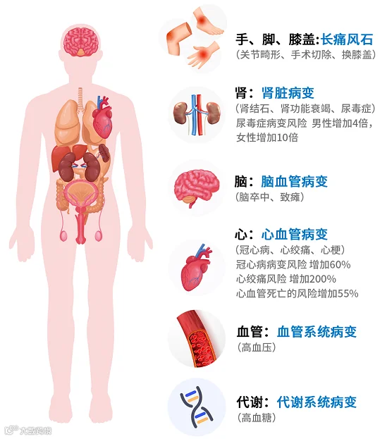 可以说,尿酸持续居高不下是百害而无一利。并且大部分并发症出现的时候都没有明显的症状,不少患者开始觉得身体出现问题的时候,就已经是中晚期了。