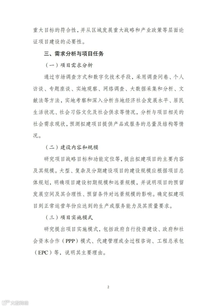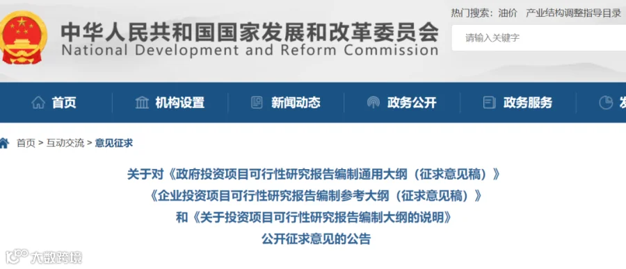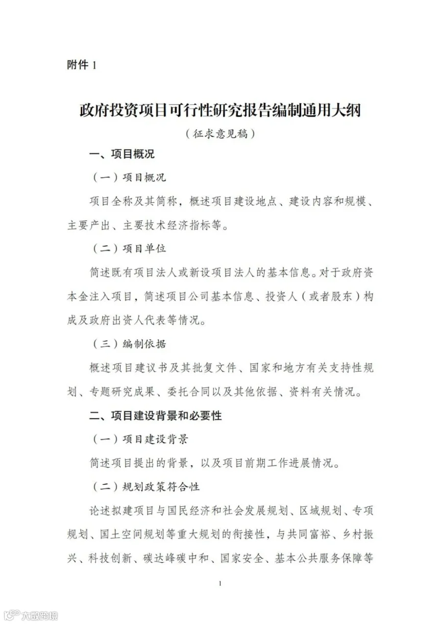 为加强对项目前期工作的指导和规范,进一步提高项目前期工作的水平,经深入调研和广泛征求意见,在2002年印发的《投资项目可行性研究指南(试用版)》基础上,国家发展改革委研究起草了《政府投资项目可行性研究报告编制通用大纲(征求意见稿)》,现向社会公开征求意见。征求意见指出: