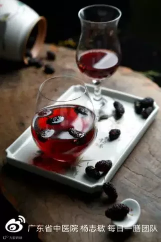 桑葚被称为“民间圣果”,其味甘性寒,具生津止渴、补肝益肾、滋阴补血、明目安神、黑发等功效。配以白酒浸泡,在滋阴养血润燥的同时,可以温通经络,适合平素肝肾亏虚,眼睛干涩,皮肤干燥等表现之人饮用。