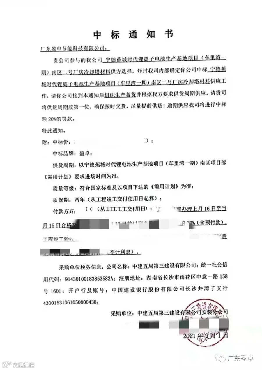 2021年09月01日,广东盈卓节能科技有限公司“广东盈卓”在辉煌的成绩上又添加一笔“宁德时代旗下的宁德蕉城时代锂离子电池生产基地项目(车里湾一期)南区二号厂房冷却塔材料供方选择”成功中标。