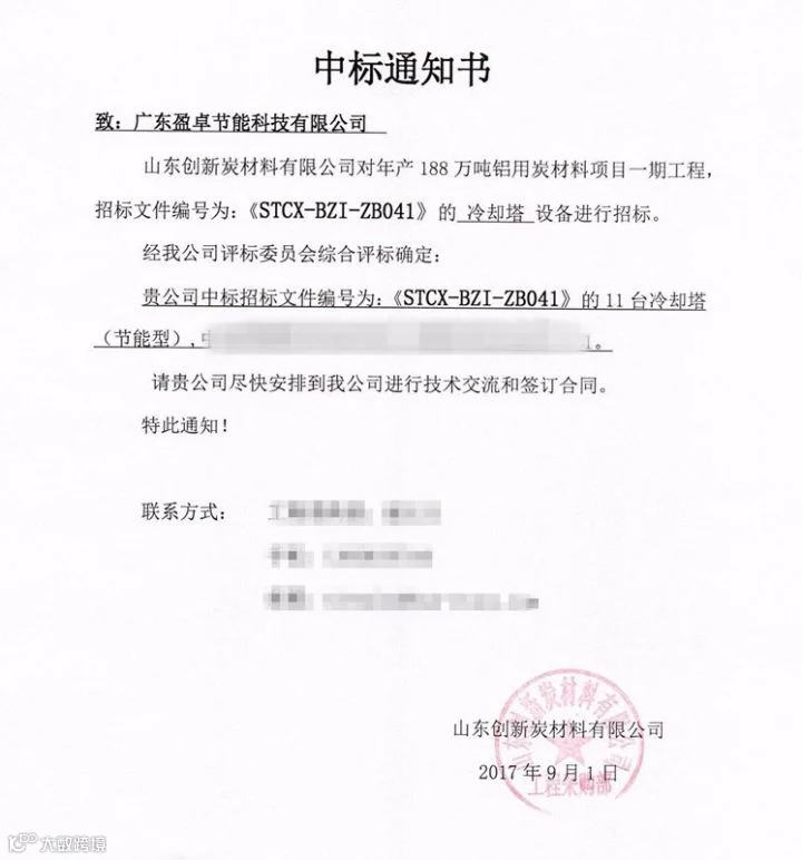 继成功获得山东鲁北集团节能冷却塔合同之后,广东盈卓公司凭借其在山东项目执行中的出色表现和优秀的技术能力,于2017年9月获得山东创新炭材料有限公司对年产188万吨铝用品炭材料项目一期工程项目的节能冷却塔供货合同。
