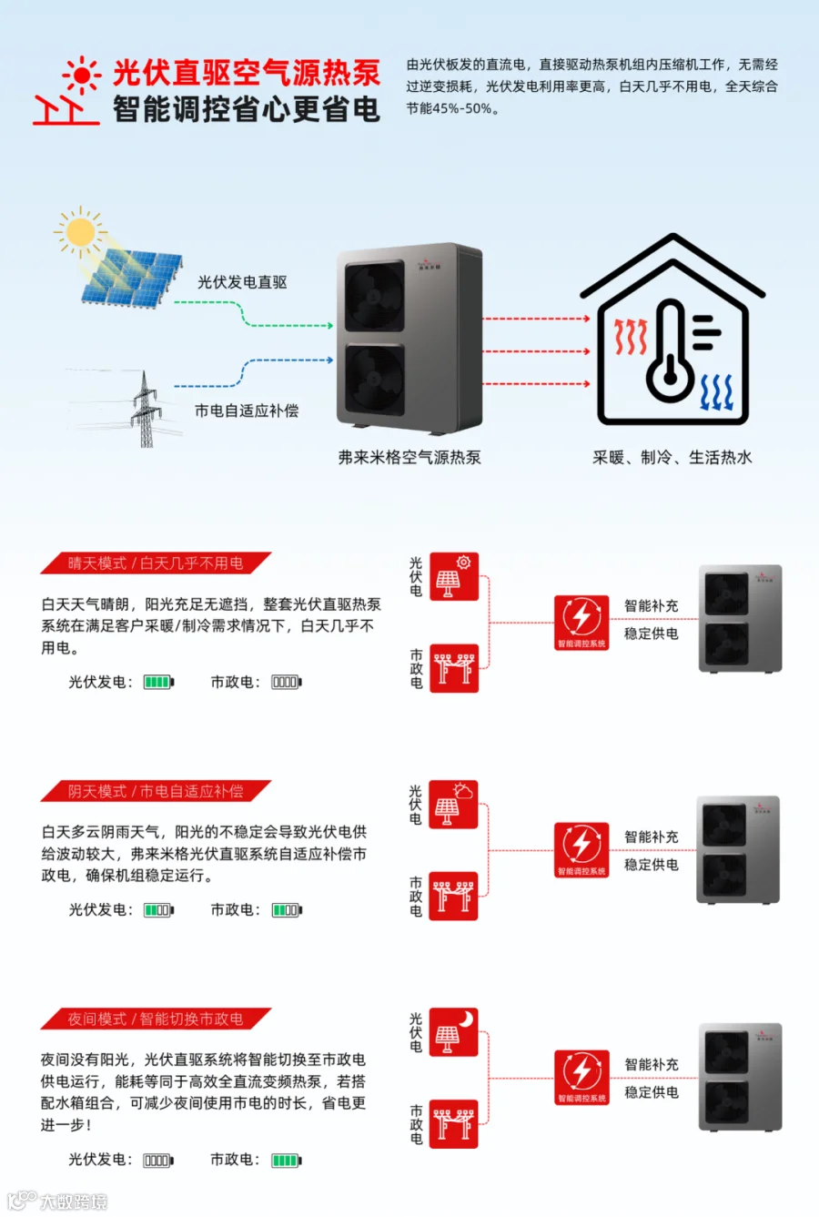 与传统系统不同的是,我们的光伏直驱热泵采用了直流直驱技术。这意味着光伏板产生的直流电可以直接驱动热泵压缩机运行,省去了中间多次交直流转换的能量损耗,大大提高了光伏发电利用率。
