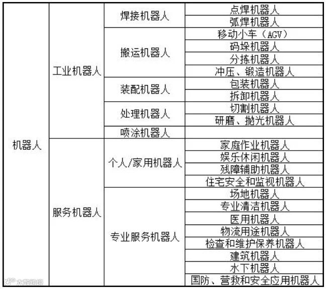 机器人是自动执行工作的机器装置,既可以接受人类指挥,又可以运行预先编排的程序,也可以根据以人工智能技术制定的原则行动。按照国际机器人联盟IFR(International Federation of Robotics)的分类,机器人一般分为工业机器人和服务机器人。