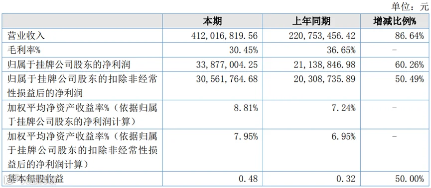 新三板创新层企业友诚科技(873087.NQ)于2022年3月31日公布2021年年度报告。2021年公司实现4.12亿的营业收入,较上年同期增长86.64%。净利润3387万,较上年同期增长60.26%。扣非净利润3056万,较上年同期增长50.49%。