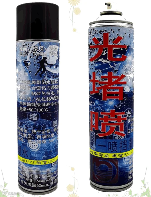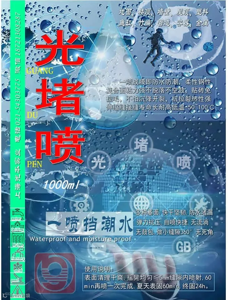 “光堵喷” 哪里漏水喷哪里 ,一喷止潮水漏,主要应用于地面、楼顶、墙壁、屋顶、鱼缸、竹编、管道、容器等物品漏水渗水返潮的修补之用,出现漏水或则返潮时,把表面清理干爽后即可用本品向上喷涂,不用任何复杂程序只是一喷成膜即防水防潮。漏水后需要堵漏,堵漏是个繁琐艰难的工作,因为堵漏是技术活,没技术很难堵漏成功,把复杂变简单是贡献,上海光本的“光堵喷”把复杂的堵漏技术变为超级简单的人人可以操作的工作,只是把“光堵喷”拿在手压按按钮一喷立即止漏。