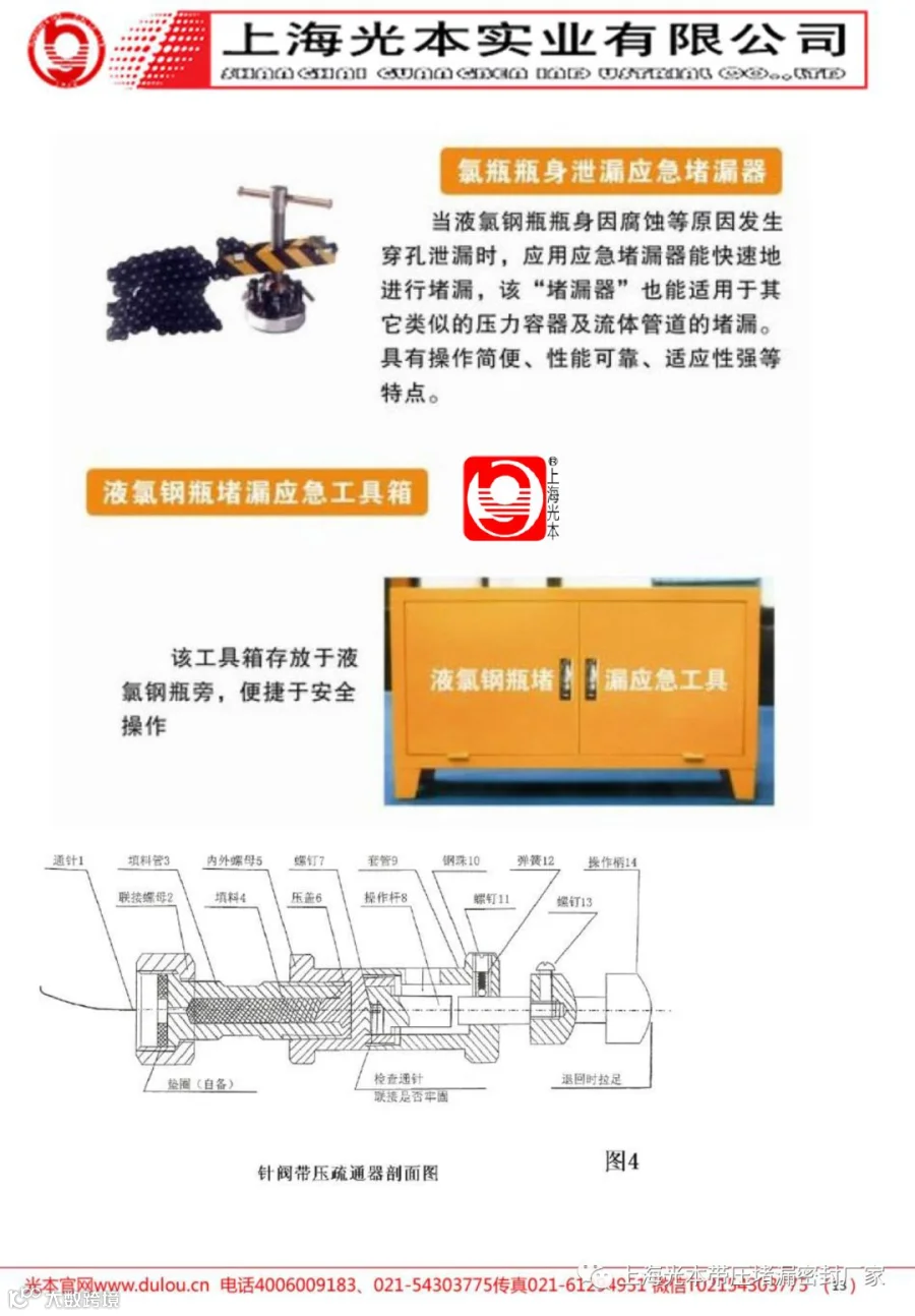 本工具是最新研发的液氯钢瓶泄漏的堵漏工具,该工具组彻底解决了原有带压换阀的危险性,具有安全、易操作等特点,是新一代的带压堵漏工具。 (堵漏工具液氯钢瓶工具组维护保养概要)