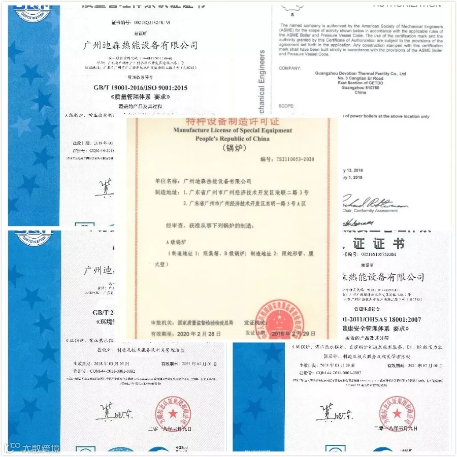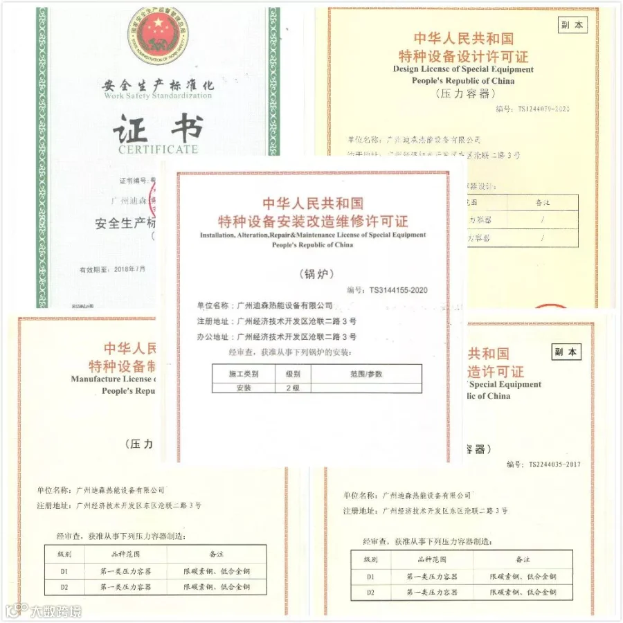 A级锅炉制造许可证/美国ASME认证/一二类压力容器设计许可证/一二类压力容器制造许可证/二级锅炉安装改造许可证/ISO9001质量管理认证、ISO10041环境管理认证、职业健康安全管理体系认证、安全生产标准化二级企业认证