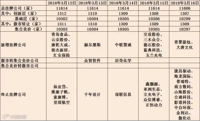 截至3月16日收市,本周5个交易日,新增挂牌公司14家,本周挂牌公司总数达11606家。