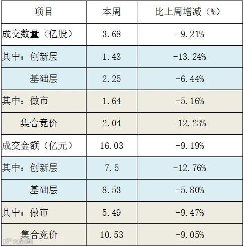 新三板本周累计成交3.68亿股,合计成交16.03亿元,较上周减少9.19%。日均成交股票个数为660只,占总挂牌企业数量的5.68%。