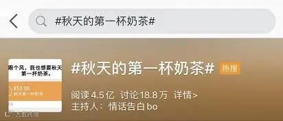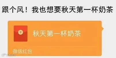 2020年9月,秋天的第一杯奶茶突然上了微博热搜,其实就是在要红包和奶茶秀恩爱或者秀感情的梗。也有人说:“指的是在这个冷冷的秋天,有一杯热乎的奶茶心里特别温暖。就是在意你的人,看到你发的消息,或者主动发你52元的奶茶钱,让你能喝到秋天的第一杯奶茶!”