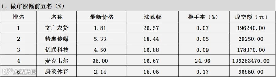 从上述表中可知:做市涨幅排在第一的文广农贷,涨幅达到26.57%,观昨日数据可知,文广农贷在6月7日跌幅为15.38。昨日跌幅排一、二名的康莱体育、文广农贷两家企业,今日涨幅都进了前五。