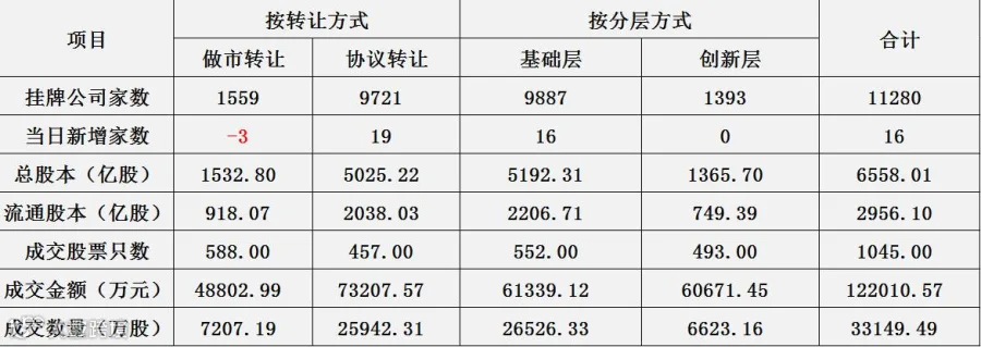 新三板挂牌总数达到11280家,其中做市转让1559家,协议转让为9721家,其中3家由做市转让变更为协议转让。按照分层方式,基础层9887家,创新层1393家。今日新增挂牌企业数为16家。