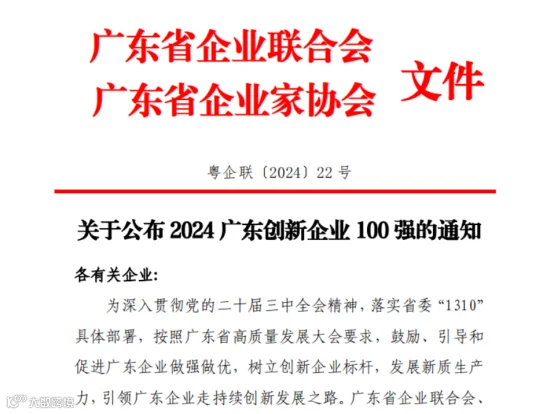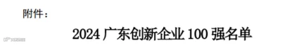 广东创新企业100强的入选企业是广东省企业联合会、广东省企业家协会在中国企联指导下,由评审专家委员会参照国际通行的方式,以2023年企业研发投入、研发机构建设、科技成果、创新指数、财务指标以及其他相关指标、数据为依据,进行遴选、公示最终确定的。本次入选的企业还包括华为、腾讯、比亚迪、广汽、中兴通讯等知名企业。
