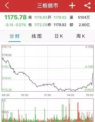 截至收盘,三板做市指数报1175.78点,跌3.14点,跌幅0.27%,成交额2.80亿元,创下自去年3月2日以来的收盘价新低。