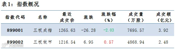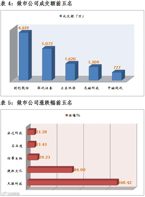 做市企业中有743只个股参与交易,成交额3.24亿元。其中415只个股上涨;4家做市企业成交额破千万,成交额前三名为:明利股份4619万、联讯证券3071万、卫东环保1620万。