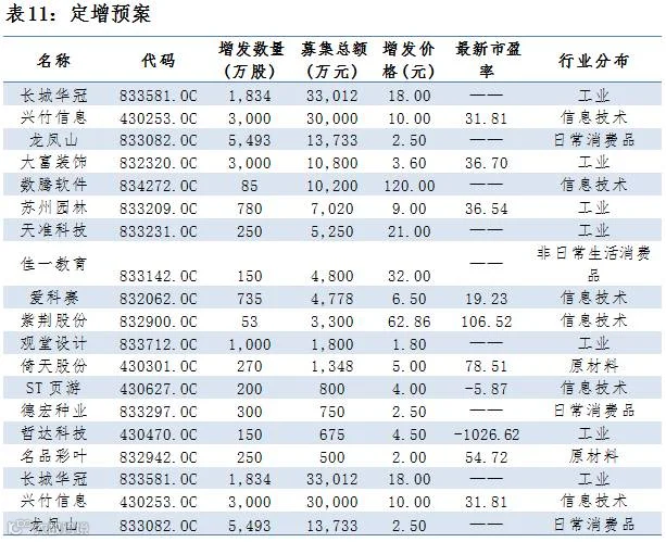 点评:11月25日,共有16家公司公布定增预案,总增发股数1.76亿股,共募集资金12.88亿元,5家公司募集资金超过1亿元,募集资金最大为长城华冠,募集资金3.30亿元,总体来看,募集金额主要流向工业行业,占比46%。