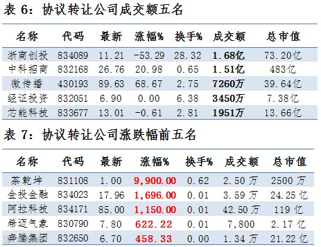 做市企业中有602只个股参与交易,成交额跌至10.30亿元。其中234只个股上涨;14家做市企业成交额破千万,其中联讯证券、明利仓储和卡联科技位列前三位,分别成交2.82亿、8867万元和4318万元。