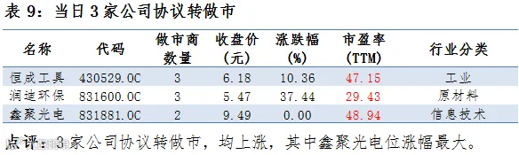 润迪环保、卡联科技和古麒羽绒涨幅居前,分别为37.44%、25.68%和19.38%。相比之下,云涛生物、国贸酝领和创尔生物则跌幅居前分别为13.96%、12.47%和12.15%。