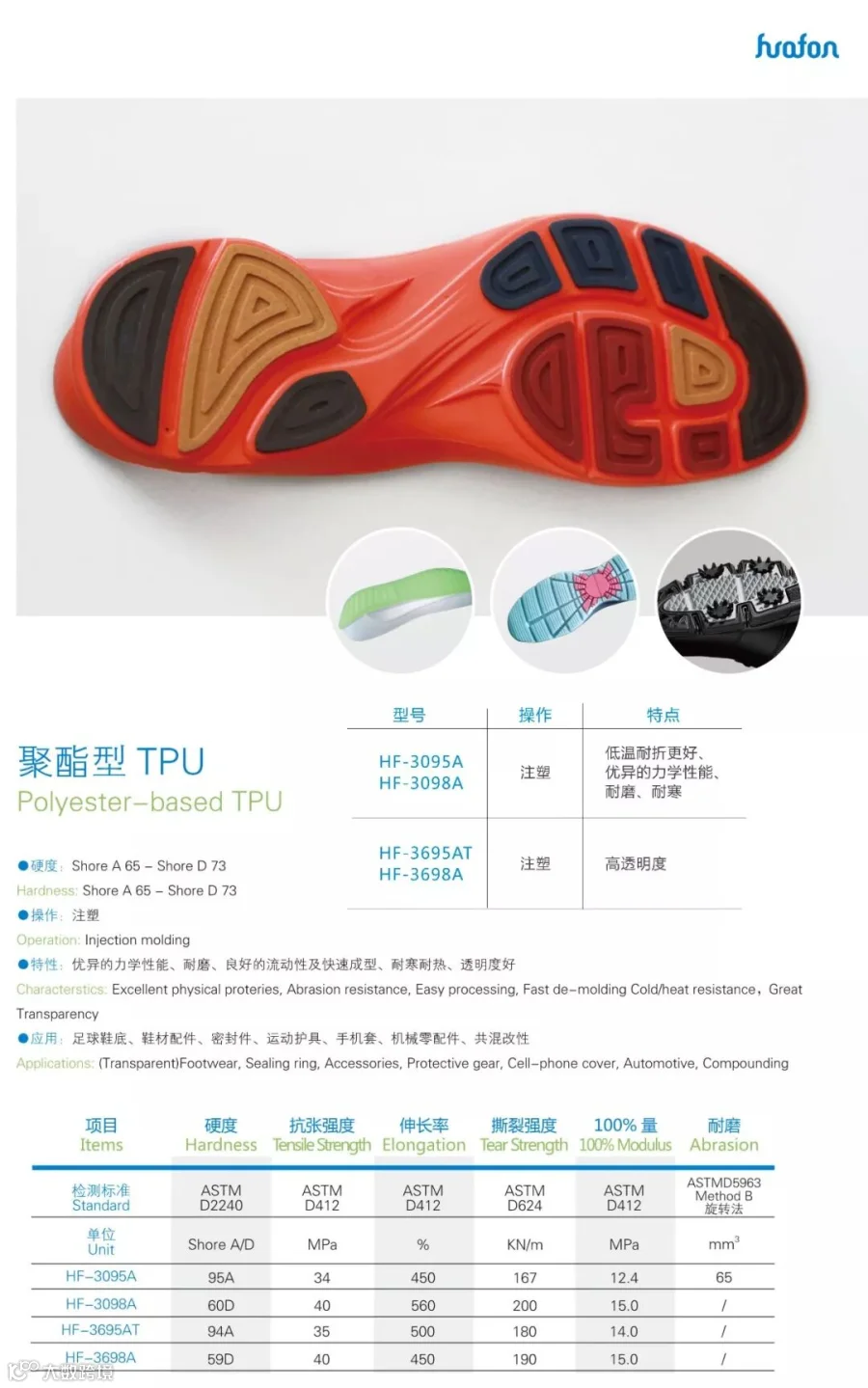 大家好,我是1号选手,采用华峰TPU制成的足球鞋底。我的家族有三位成员,分别是普通型、耐寒型、高透型,其中普通型具有低温耐折,优异的力学性能,耐磨;耐寒型具有低温耐折更好,优异的力学性能,耐磨、耐寒,灰常灰常适合本次世界杯举办地——俄罗斯的气候环境;高透型,顾名思义,就是高透明度。