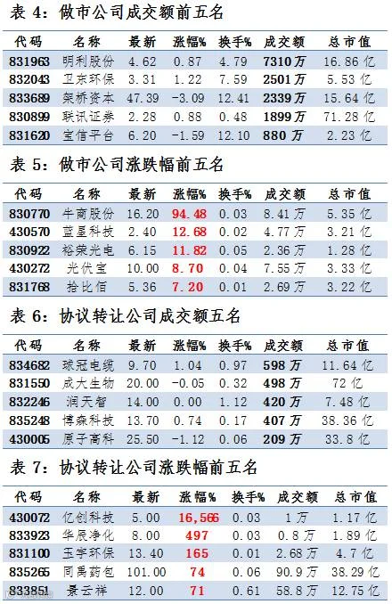 牛商股份、蓝星科技、裕荣光电涨幅居前,分别为94.48%、12.68%和11.82%。相比之下,瀚远科技、众引传播、尔格科技跌幅居前,分别为54.61%、23.10%和12.79%。