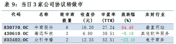 点评:3家公司协议转做市,1家上涨、2家下跌,牛商股份协议转做市首日涨幅居做市企业第一。