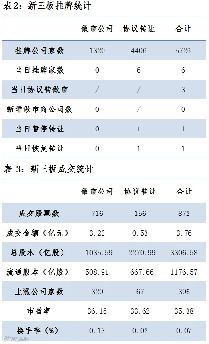 做市企业中有716只个股参与交易,成交额3.23亿元。其中329只个股上涨;4家做市企业成交额破千万:明利股份71310万、卫东环保2501万、架桥资本2339万、联讯证券1899万。