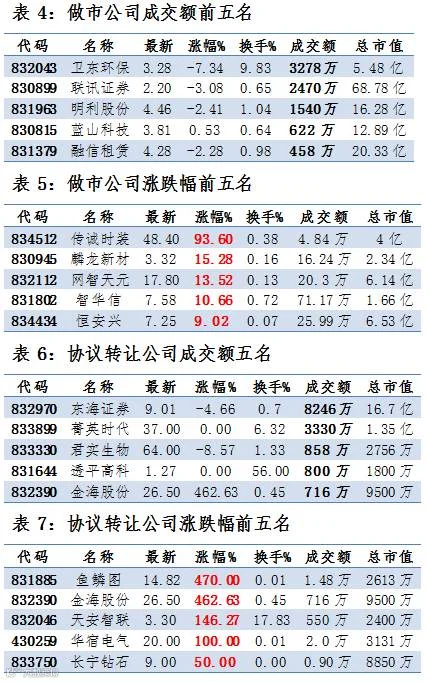 做市企业中有657只个股参与交易,成交额2.17亿元。其中269只个股上涨;3家做市企业成交额破千万:卫东环保3277万、联讯证券2470万、明利股份1540万。