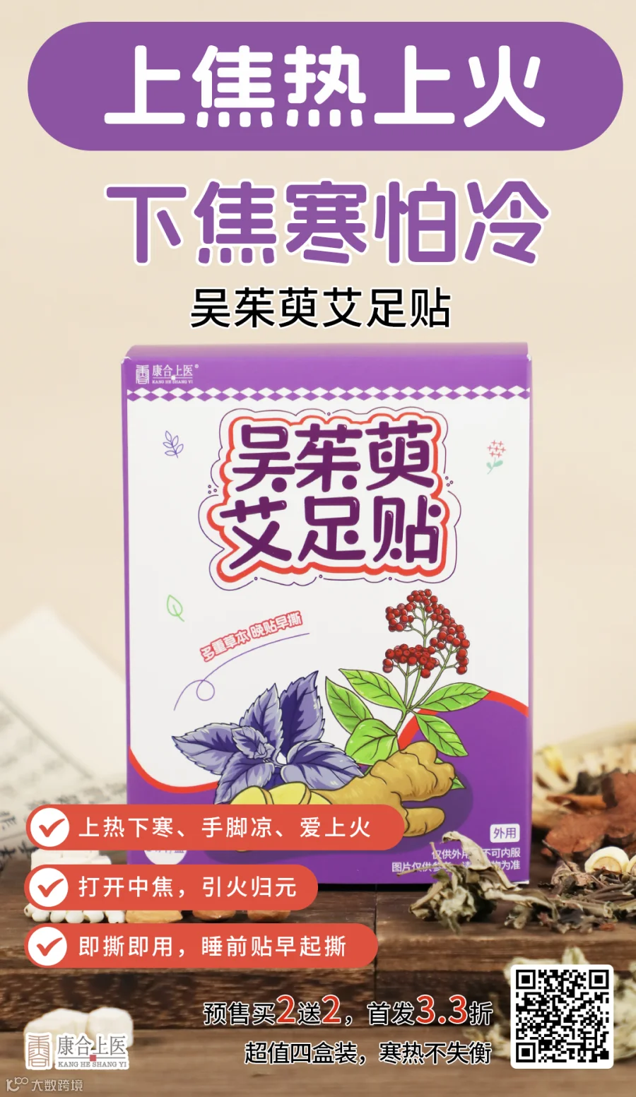 吴茱萸艾足贴,除了甄选道地南阳吴茱萸、艾叶,还添加了紫苏、菝葜、生姜等9味草本配伍,睡前贴早起撕,温通气机,协助把火气化为元气。