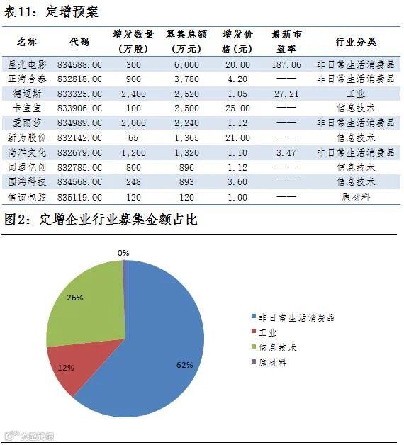 点评:1月20日,共有23家公司公布定增预案,总增发股数8133万股,共募集资金2.16亿元,0家公司募集资金超过1亿元,募集资金最大为星光电影,募集资金6000万元,总体来看,募集金额主要流向非日常生活消费品行业,占比62%。