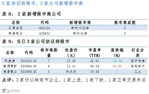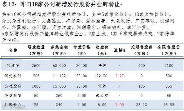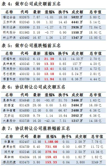 做市企业中有640只个股参与交易,成交额4.35亿元。其中230只个股上涨;8家做市企业成交额破千万,其中福达合金、卫东环保和联讯证券位列前三位,分别成交5822万元、4441万元和2926万元。
