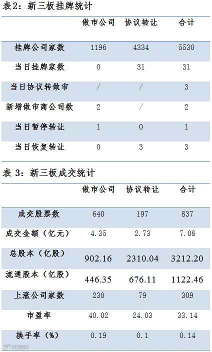 昨日三板有837只股票成交,总成交额跌至7.08亿元。其中做市成交4.35亿;协议成交2.73亿元。
