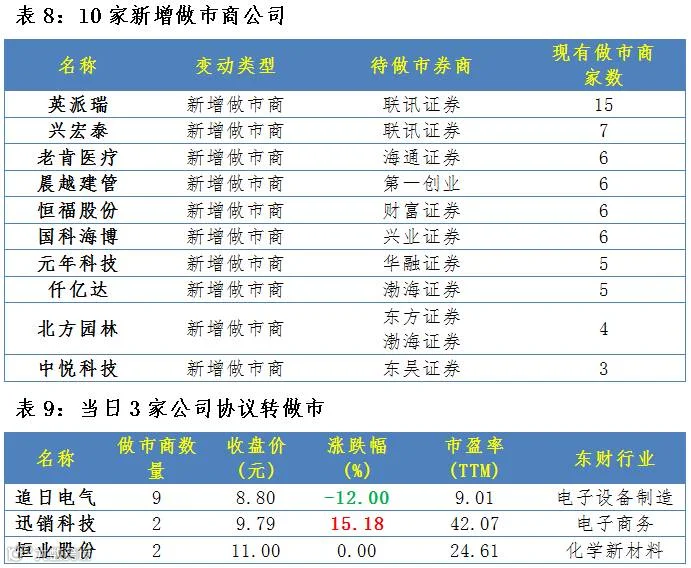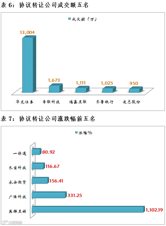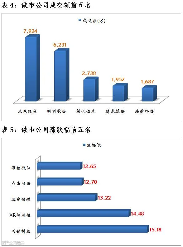 做市企业中有801只个股参与交易,成交额5.21亿元。其中406只个股上涨;10家做市企业成交额破千万,成交额前三名为:卫东环保7924万、明利股份6230万、联讯证券2737万。