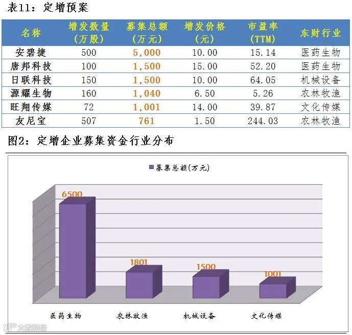 点评:3月22日,共有6家公司公布定增预案,总增发股数1489股,共募集资金1.08亿元。募集资金超过五千万元的有1家,募集资金最大为安碧捷,募集资金5000万元,总体来看,募集金额流向医药生物行业较多。