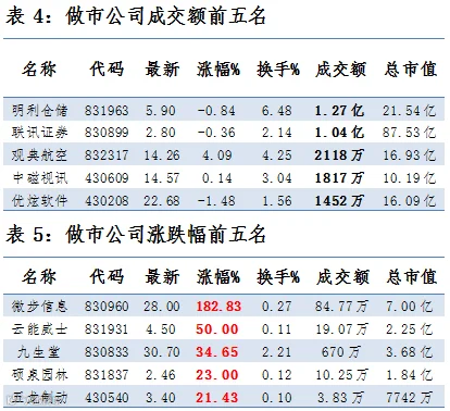 做市企业中有600只个股参与交易,成交额6.62亿元。其中300只个股上涨;10家做市企业成交额破千万,其中明利仓储、联讯证券和观典航空位列前三位,分别成交1.27亿、1.04亿元和2118万元。