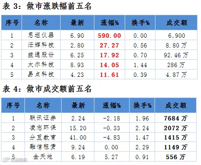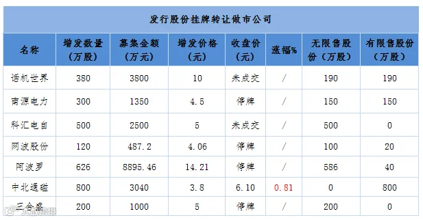 点评:7家做市企业发行股份并转让。其中1家上涨,2家正常交易未成交、4家停牌未申报。