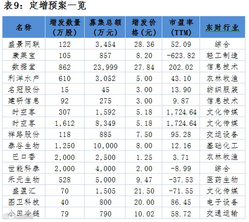 点评:15家公司共募集6.71亿元。定增企业行业分布中农林牧渔、文化传媒、信息技术和综合行业占比较大,募集资金最大的为数据堂,募集资金2.4亿元。
