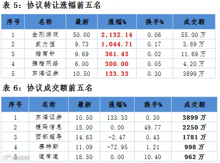 表10、昨日23家公司新增发行股份并挂牌转让:7家做市;16家协议转让,分别是西驰电气、欧丽信大、银河激光、均信担保、泰利模具、金泉股份、兴致科技、雅洁源、北方嘉科、那然生命、协盛科技、环创科技、莱姆佳、网动股份、金日创、盛景网联。