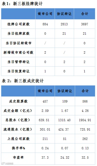 上周五新三板报566只个股参与交易,其中262只个股上涨。成交额持续低迷状态,报4.26亿元。其中做市公司成交2.59亿、协议转让公司成交1.67亿