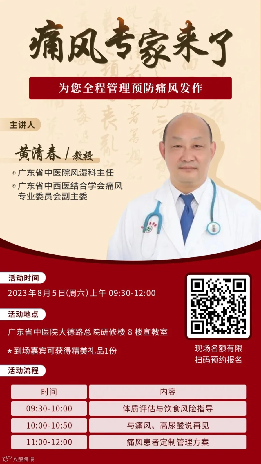 扫码预约报名参加本次痛风患教活动,预约成功并现场参加的痛风患者可获得精美礼品,还有机会获得黄清春教授著作的《痛风中医调养》书籍及特色疗法体验哦!名额有限,快扫码报名吧!