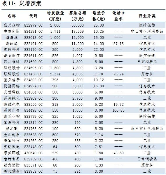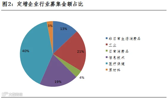 点评:12月15日,共有25家公司公布定增预案,总增发股数1.56亿股,共募集资金14.02亿元,4家公司募集资金超过1亿元,募集资金最大为弘天生物,募集资金5亿元,总体来看,募集金额主要流向医疗保健行业,占比40%。