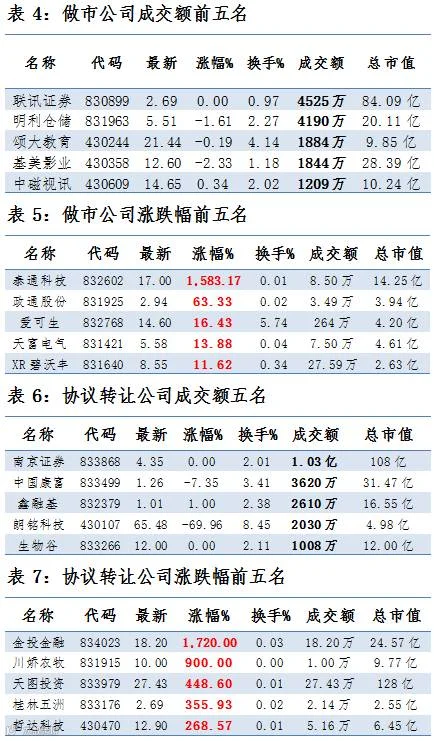 做市企业中有630只个股参与交易,成交额5.21亿元。其中285只个股上涨;7家做市企业成交额破千万,其中联讯证券、明利仓储和颂大教育位列前三位,分别成交4525万、4190万元和1884万元。