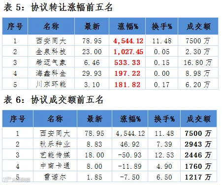 涨跌幅方面, 5只股票涨幅超过100%,其中西安同大、金泉科技和希迈气象居前列,涨幅分别为4544.12%、1027.45%和533.33%。相比之下,科宏生物、润迪环保和蓝星科技则跌幅居前分别为99.88%、66.25%和59.63%。