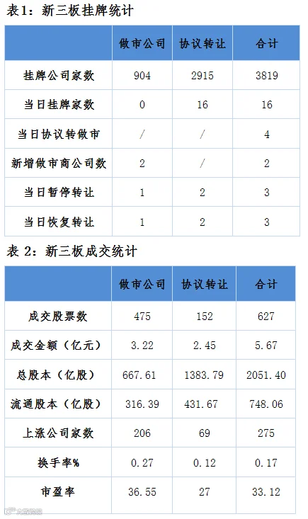昨日三板有627只个股参与交易,其中275只个股上涨。成交额回落至5.67亿。其中做市公司成交3.22亿、协议转让公司成交2.45亿。